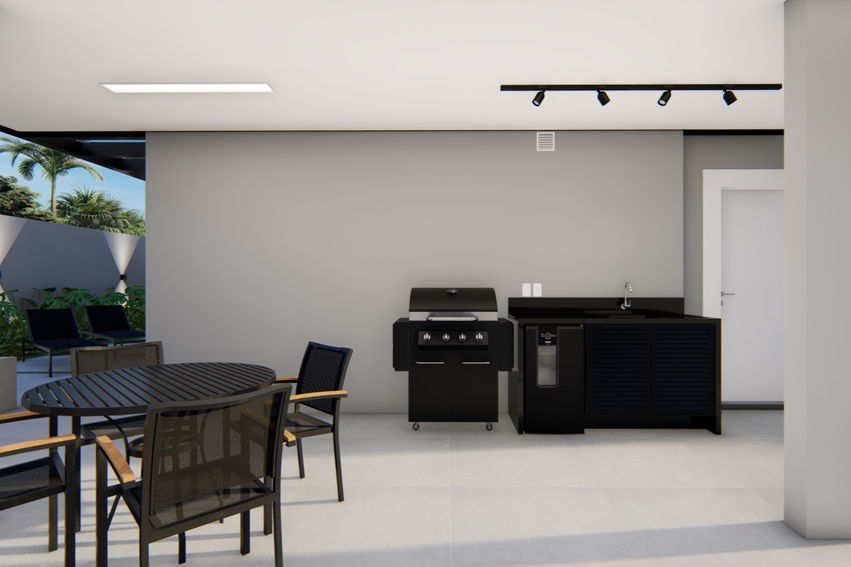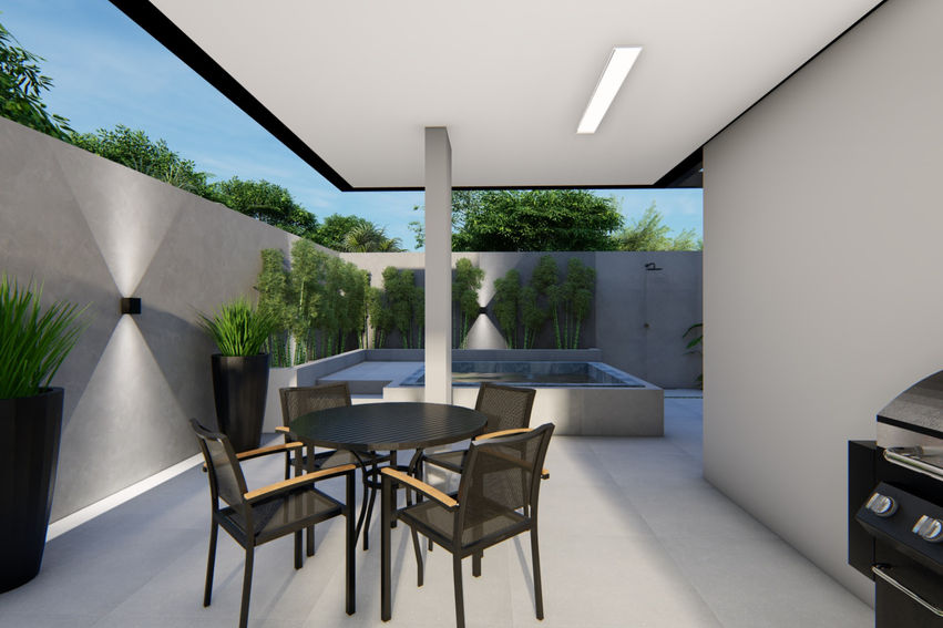 Neste projeto, a área externa da residência recebeu novo desenho de piso, paisagismo, coberturas, spa e área gourmet, criando um espaço agradável de lazer e estar.