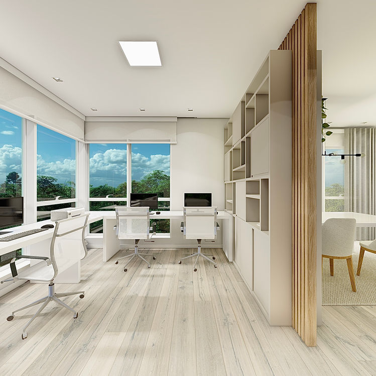A proposta desse projeto foi a criação de dois ambientes, sendo um de trabalho e outro de reunião, sem abrir mão da integração e da permeabilidade do espaço como um todo. Além da iluminação bem trabalhada, destaca-se o uso de tons claros e amadeirados na composição desse projeto, criando um ambiente clean e ao mesmo tempo aconchegante.